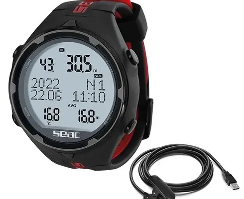 SEAC Action HR 스쿠버 및 프리다이빙용 USB 케이블이 있는 다이빙 컴퓨터 다이빙 로그북 다이빙 플래너 안전 알람, 블랙/레드, 1개