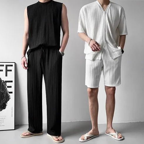 [SET]아이스 플리츠 셋업 반팔 긴팔 가디건 반바지 와이드 조거 세트(2color)